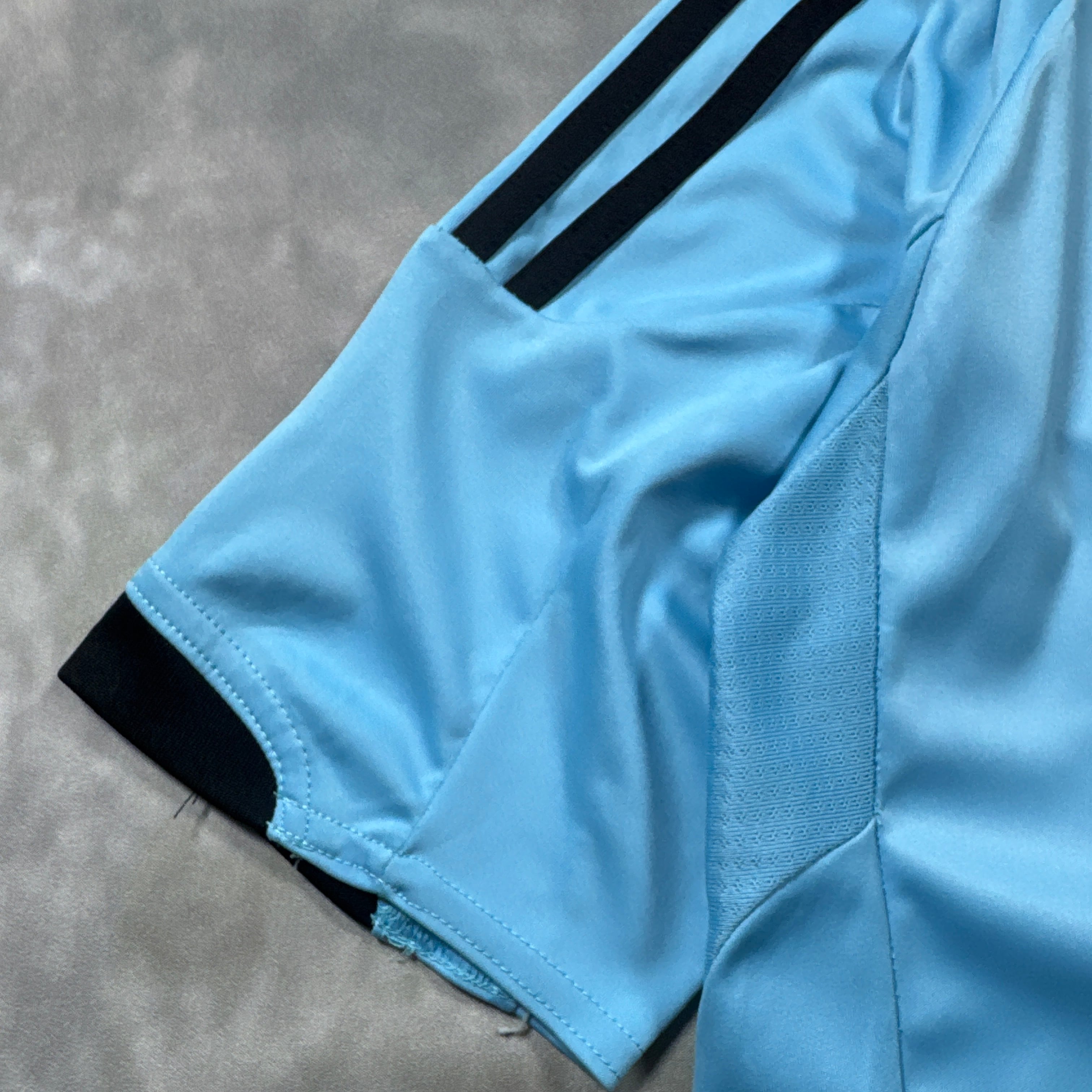 歴史的な2010 FIFAワールドカップ南アフリカ大会で着用された、スペイン代表アウェイユニフォーム。淡いスカイブルーに斜めのストライプデザインが特徴的で、シンプルかつモダンな存在感を放つ一着。